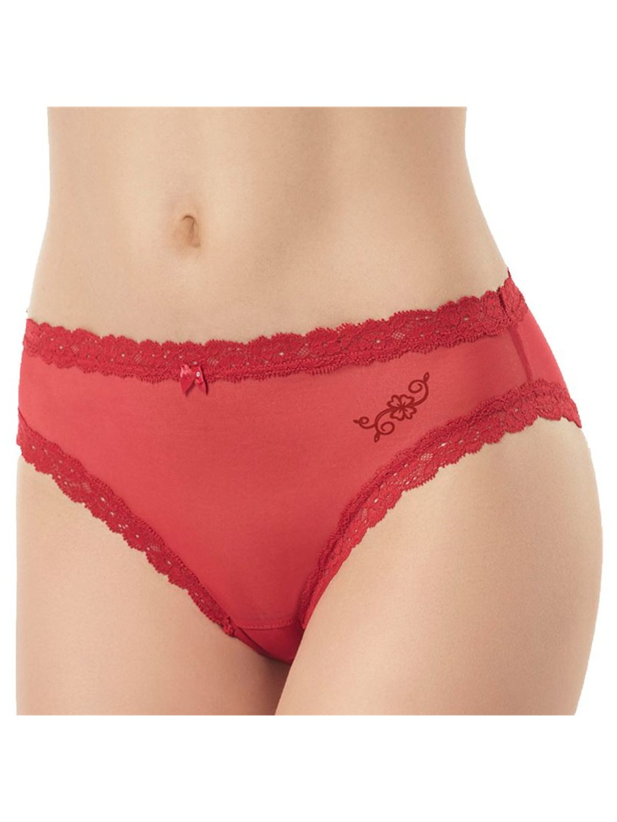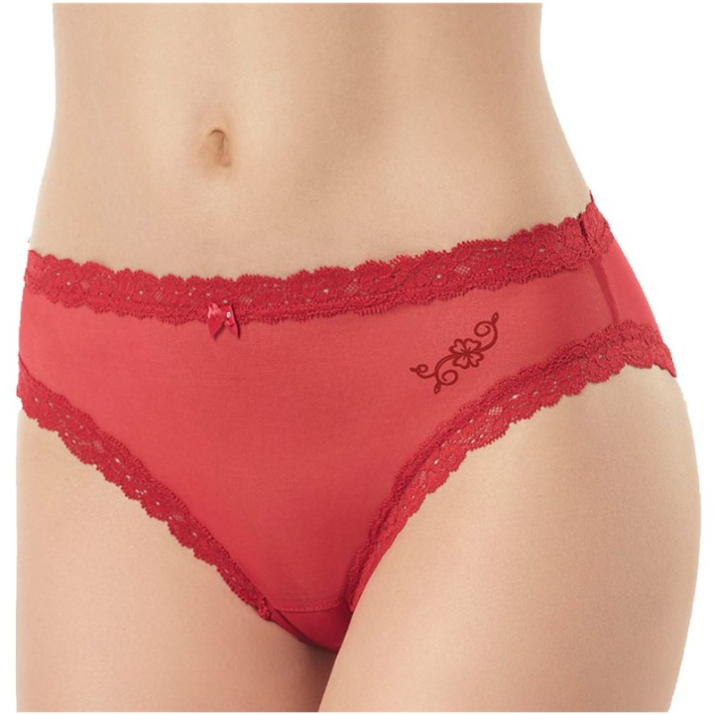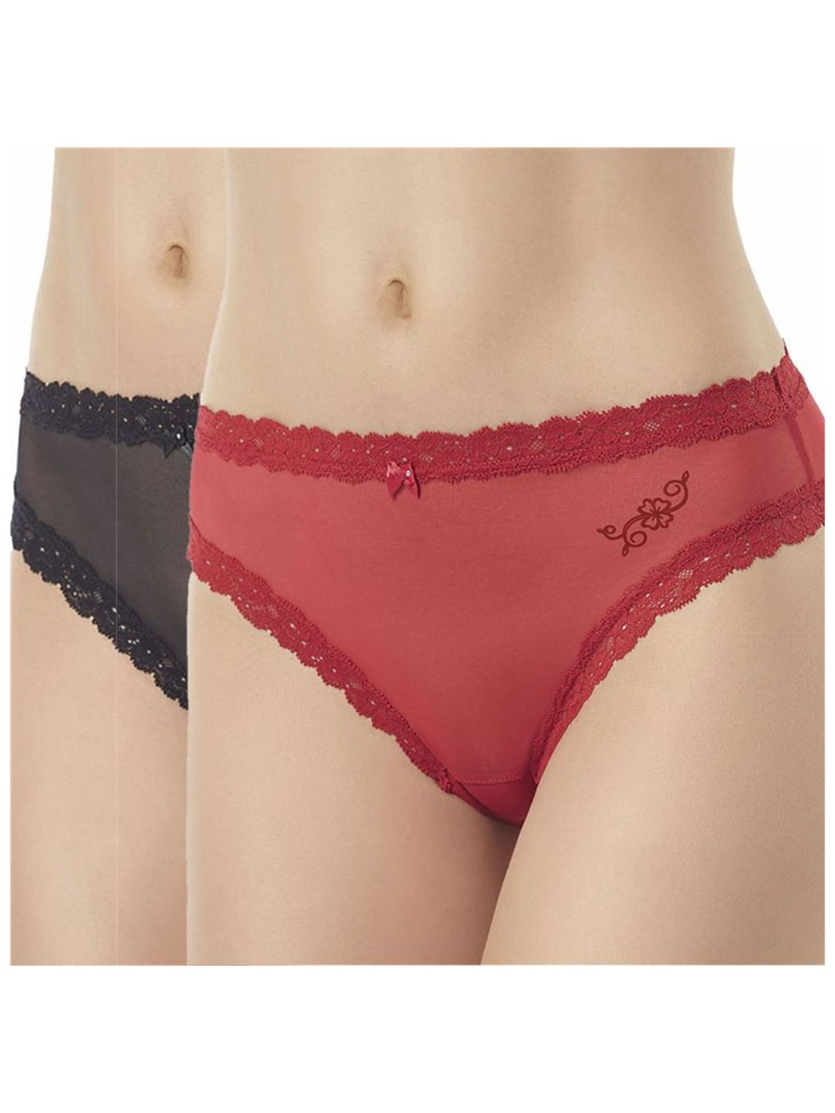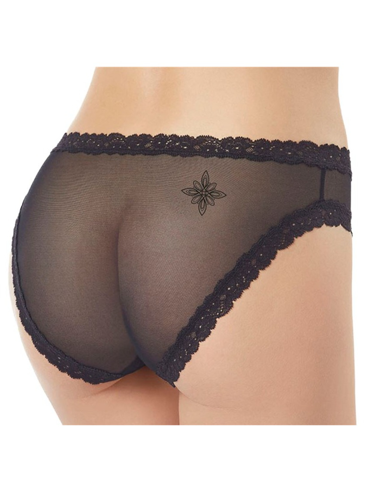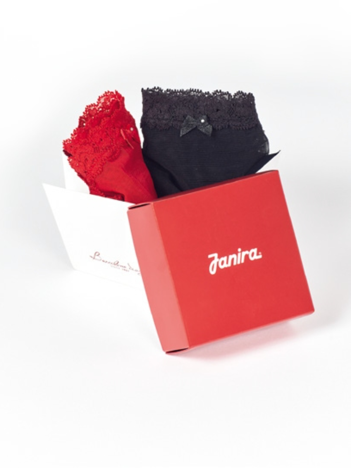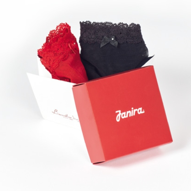 Dárková krabička s překvapením, která obsahuje dva kusy strečových tylových kalhotek. Tyl je zdoben motivem tetování s jiným designem v každé barvě: černé kalhotky mají hvězdicový vzor vzadu, červené kalhotky mají vepředu květinku.
