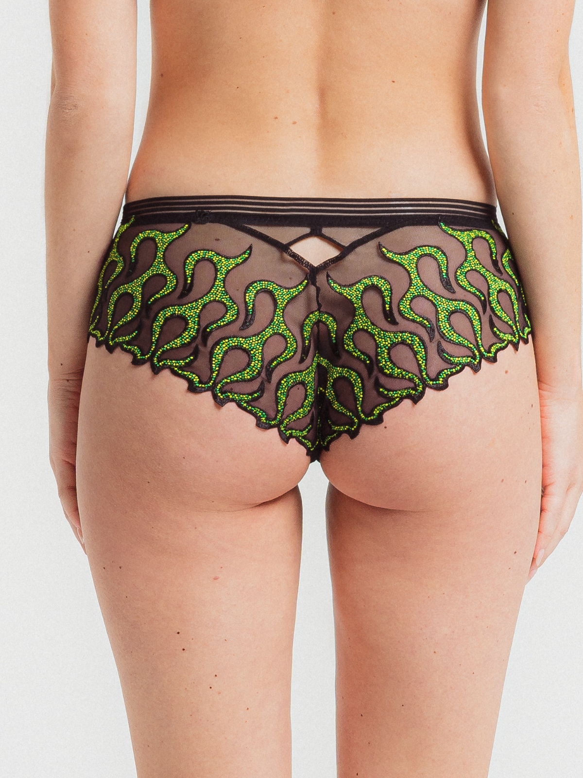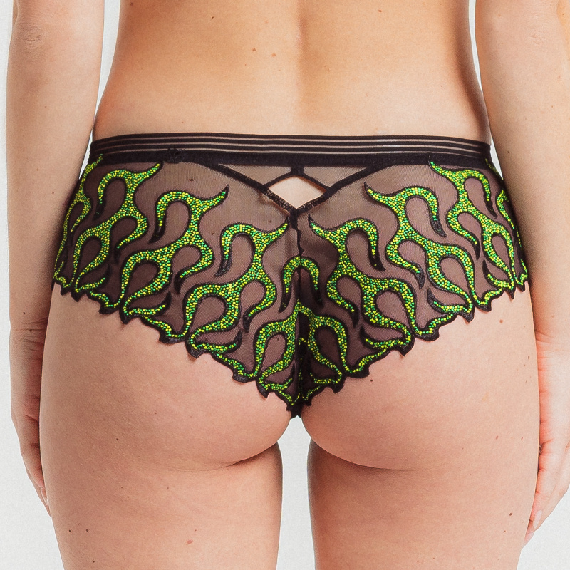 Kalhotky byly navrženy pro odvážné ženy, které se nebojí zazářit. Luxusní spojení průhledného tylu, sametu, výrazných třpytivých výšivek a rafinovaných pásků je zárukou originální smyslnosti. Vystupte z davu s kolekcí Burning love.
