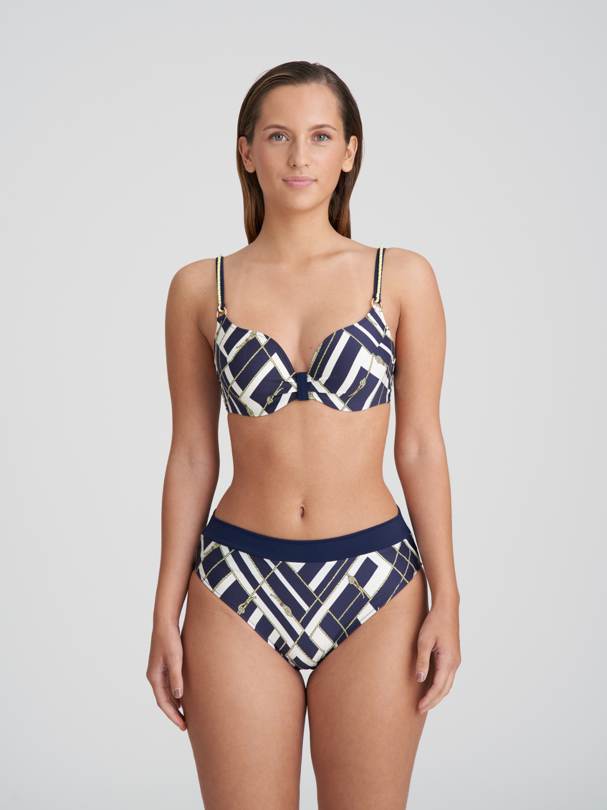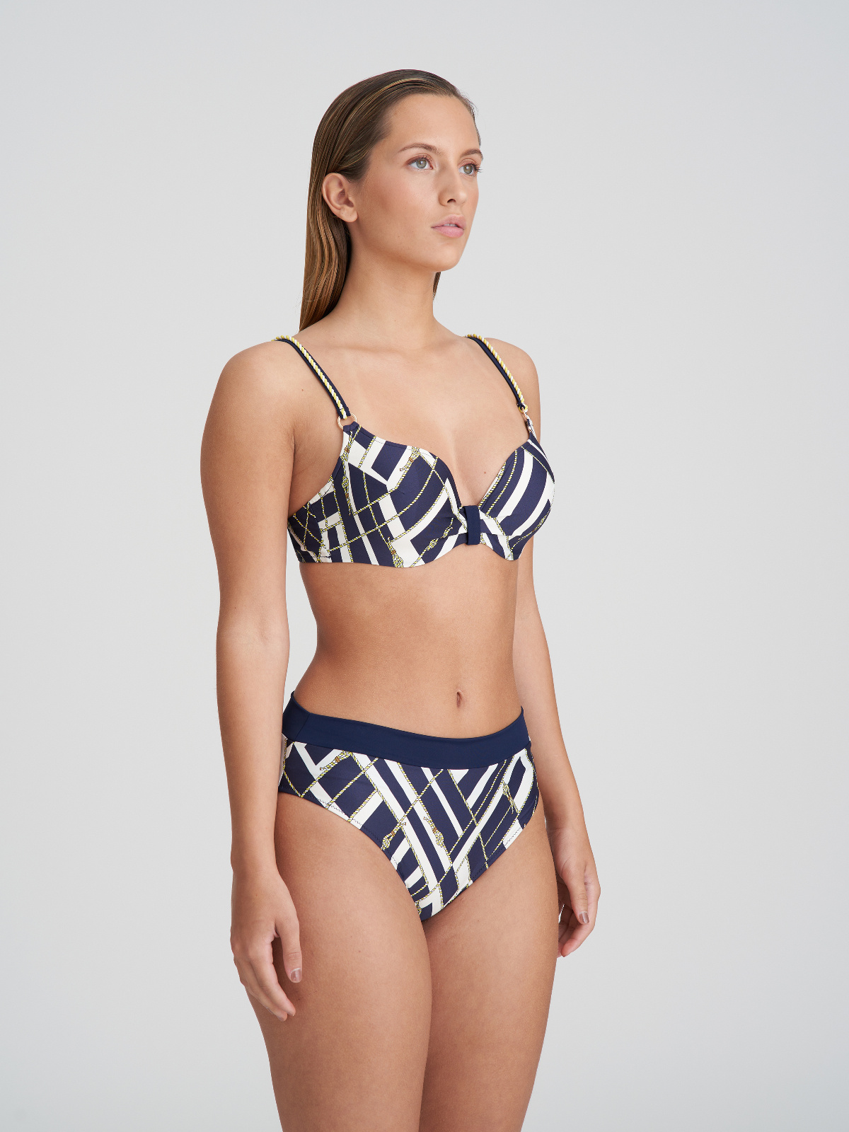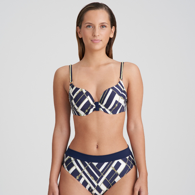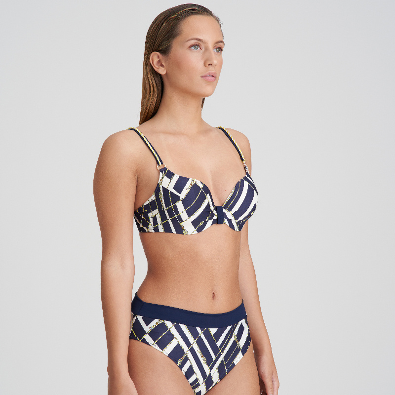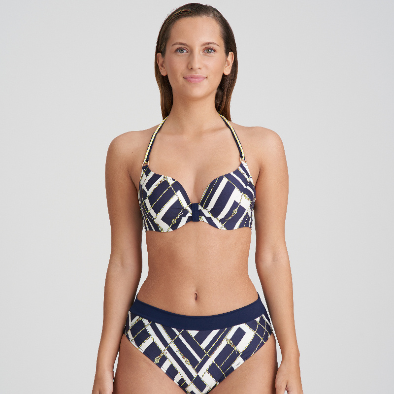 Vyztužená plavková podprsenka se inspirovala ikonickým námořnickým stylem a kromě klasické barevné kombinace vyniká zlatými detaily a elegantími lodními provazy. Tak hurá na palubu s kolekcí Saranji.