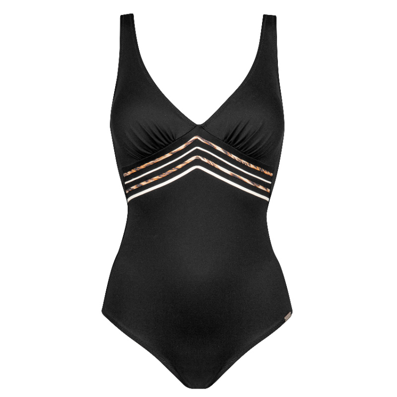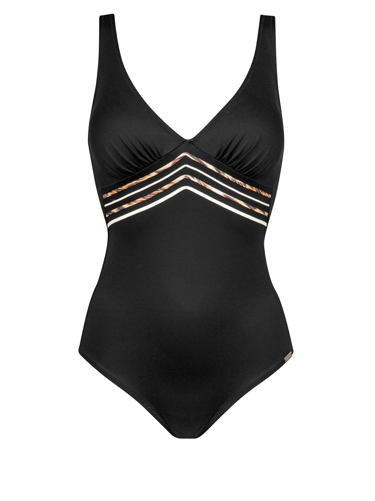 Jemně vyztužené jednodílné plavky z kolekce Jungle stripes jsou elegantním dotekem džungle. Nadčasové pruhy leopardích vzorů dotvářejí elegantní černý základ a spolu se silně stahujícím efektem vykreslí vaši siluetu do dokonalosti. Buďte za kočku se značkou Charmline.