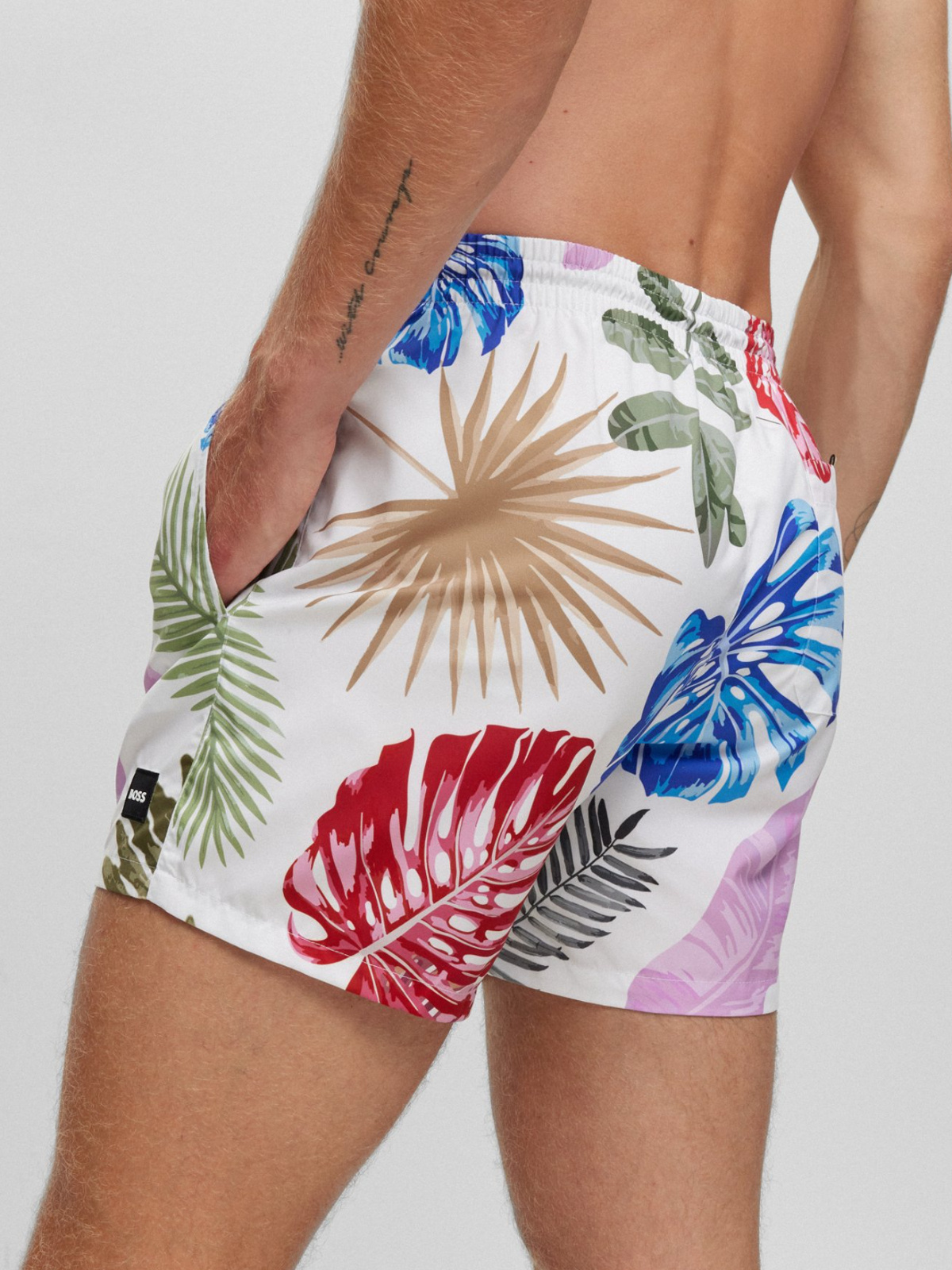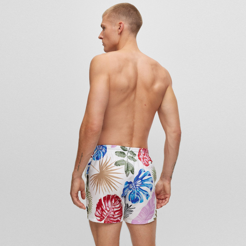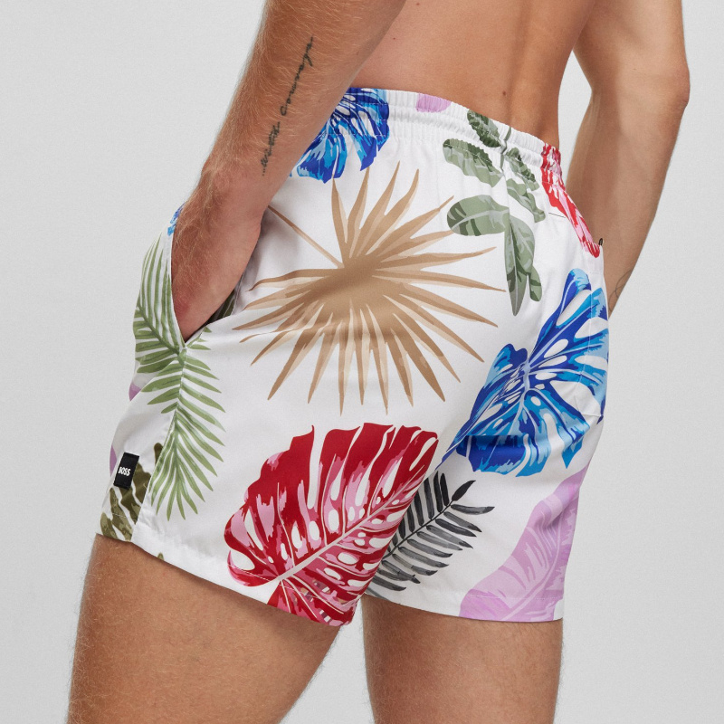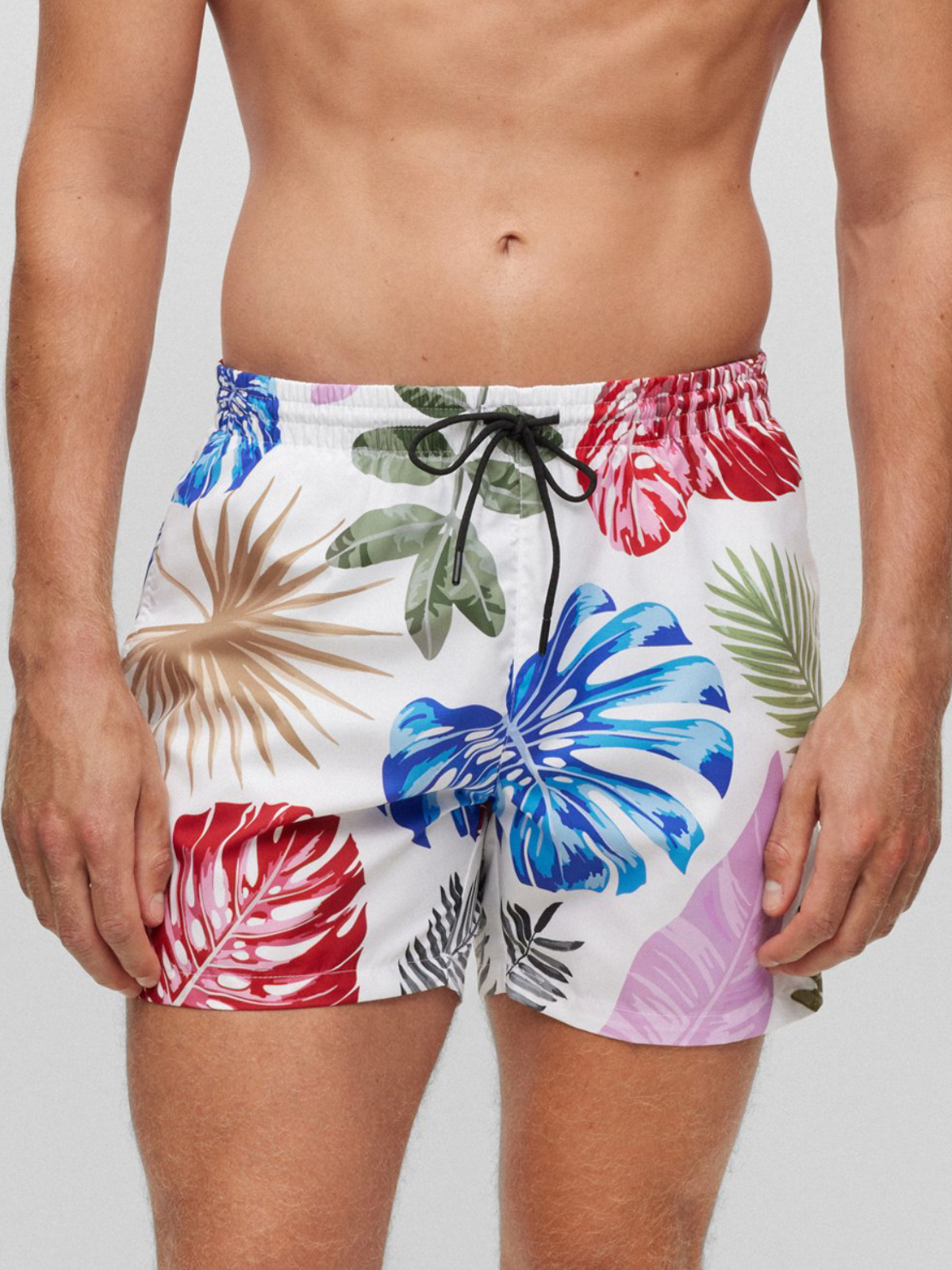 Živý potisk podrthuje dokonalý pocit z dovolené na pláži. Rychleschnoucí šortky jsou vyrobeny z polyesteru. Pas nese praktické zavazování a boční kapsy pojmou pár drobností.