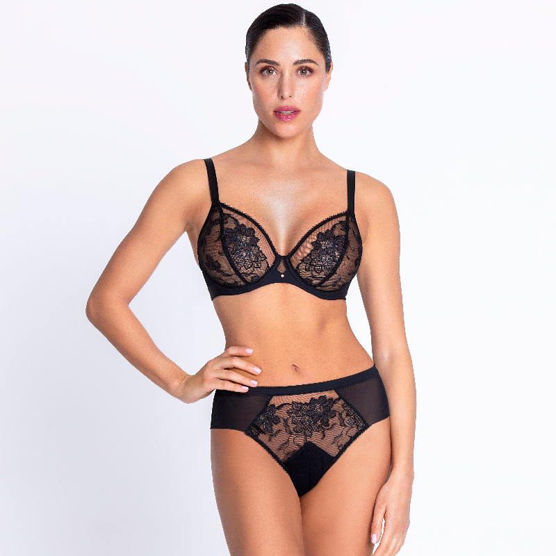 Nevyztužená podprsenka vám splní všechny touhy a přání. Luxusní ručně aplikovaná výšivka doplněná lurexovými nitěmi a luxusní francouzská Leavers krajka vytváří neskutečně smyslné prádlo, kterému jen těžko odoláte. Rozehrajte hru plnou rafinovaného svádění s Adorable en sexy.