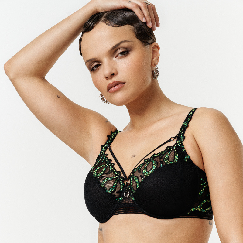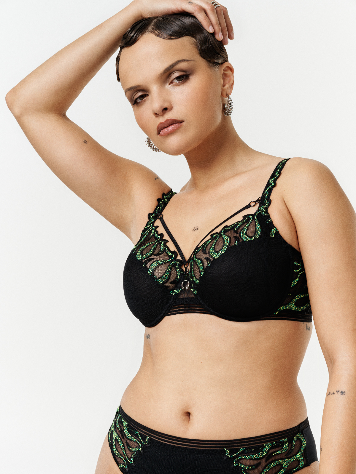 Nevyztužená podprsenka byla navržena pro odvážné ženy, které se nebojí zazářit. Luxusní spojení průhledného tylu, sametu, výrazných třpytivých výšivek a rafinovaných pásků je zárukou originální smyslnosti. Vystupte z davu s kolekcí Burning love.