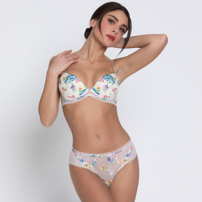 Vyztužená podprsenka se vyrovná dokonalosti okvětního plátku. Luxusní výšivka nechá na vašich křivkách vykvést letní louku hýřící nádhernými barvami. Bílý tyl dává vyniknout zářivým barvám výšivky a dokonale potrhuje romantický styl. Objevte oslnivou krásu přírody s kolekcí Baisers legers.