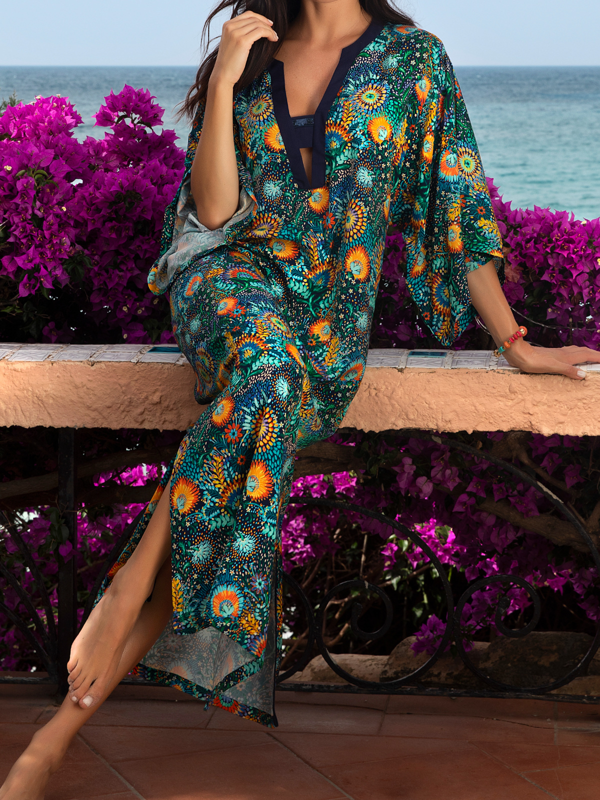 Dlouhá plážová tunika vás zahalí do úchvatného uměleckého díla. Květinový potisk inspirovaný slavným obrazem Van Gogha doplněný třpytivými flitry rozzáří vaše křivky i letní opálení. Vychutnejte si léto plné vesmírné krásy s plážovými doplňky Beaute cosmique.