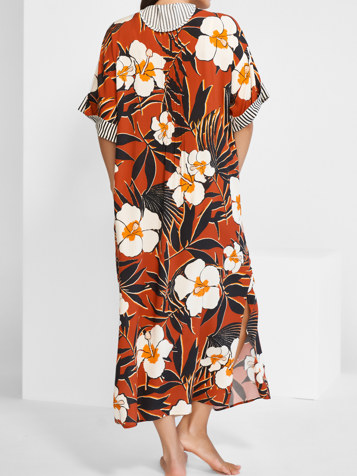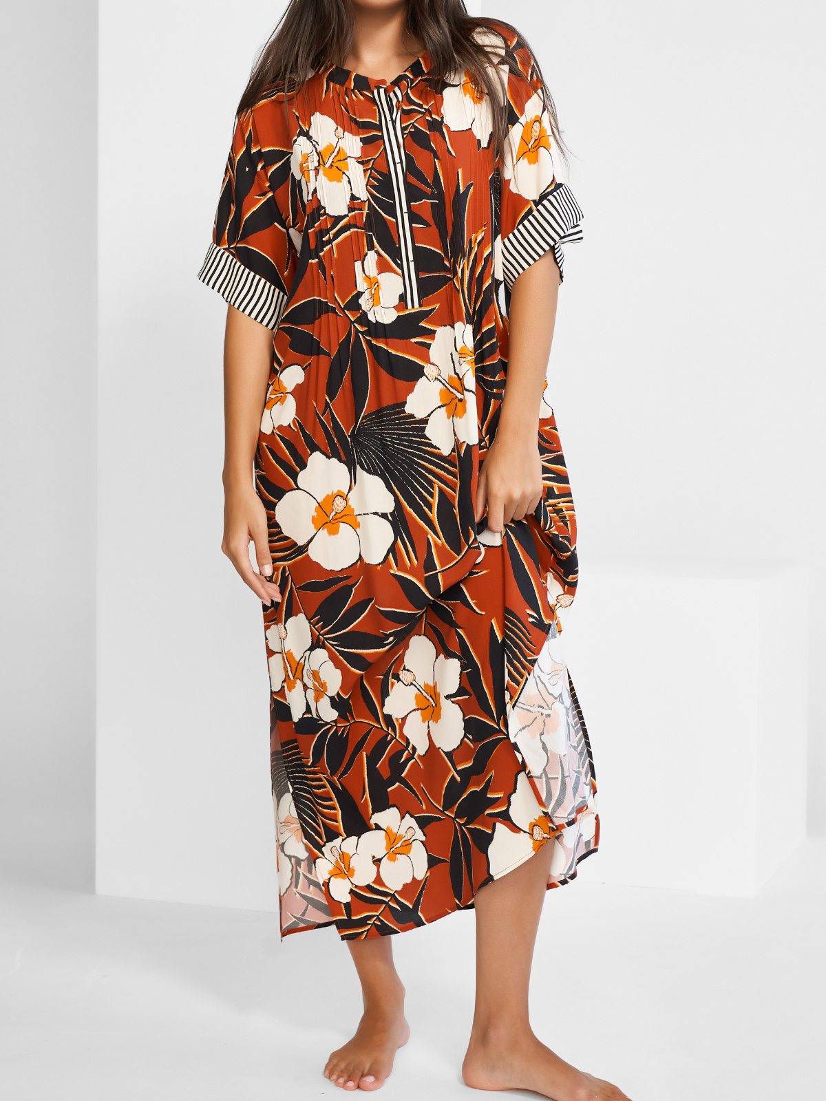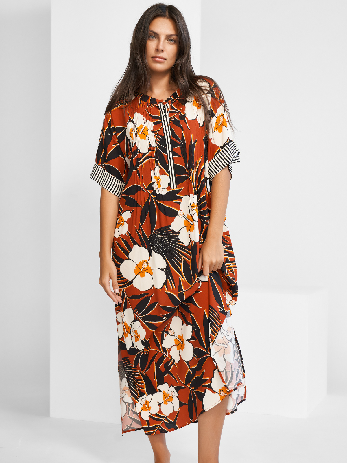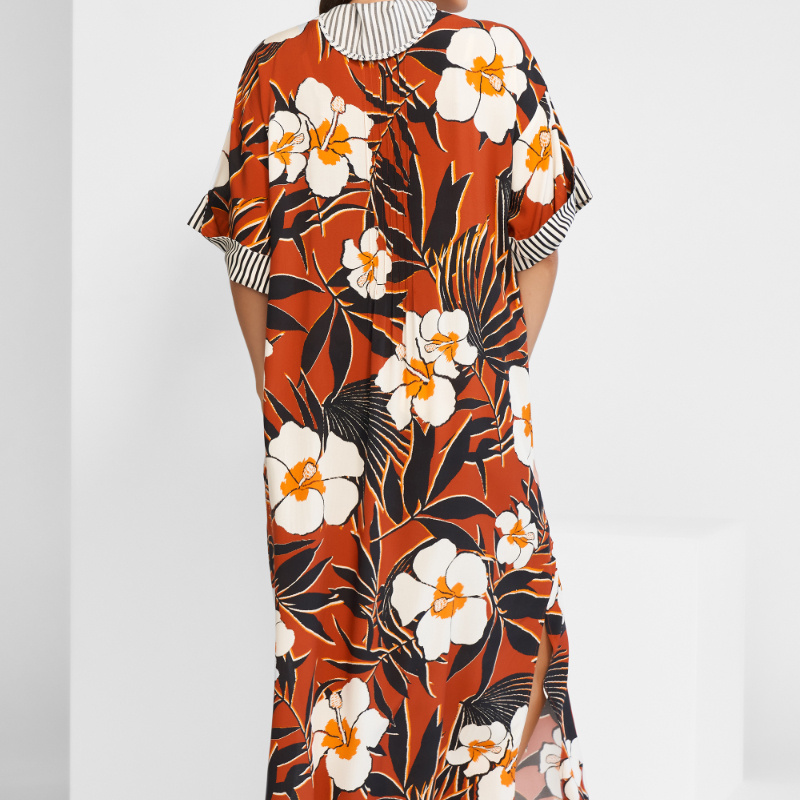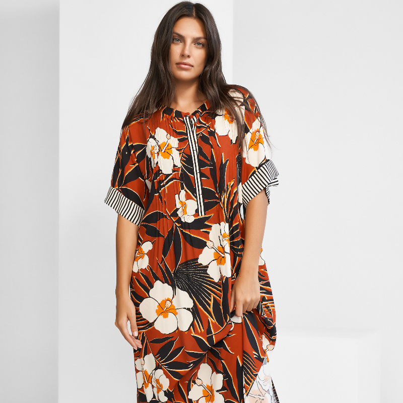 Dlouhá tunika z kolekce Art nautic, jež mísí design velkých květů ze sedmdesátých let s elegantními námořnickými pruhy. Tato netradiční kombinace perfektně funguje a působí svěže i elegantně zároveň. Nemějte strach z velkých vzorů, značka Maryan Mehlhorn ví jak na ně.