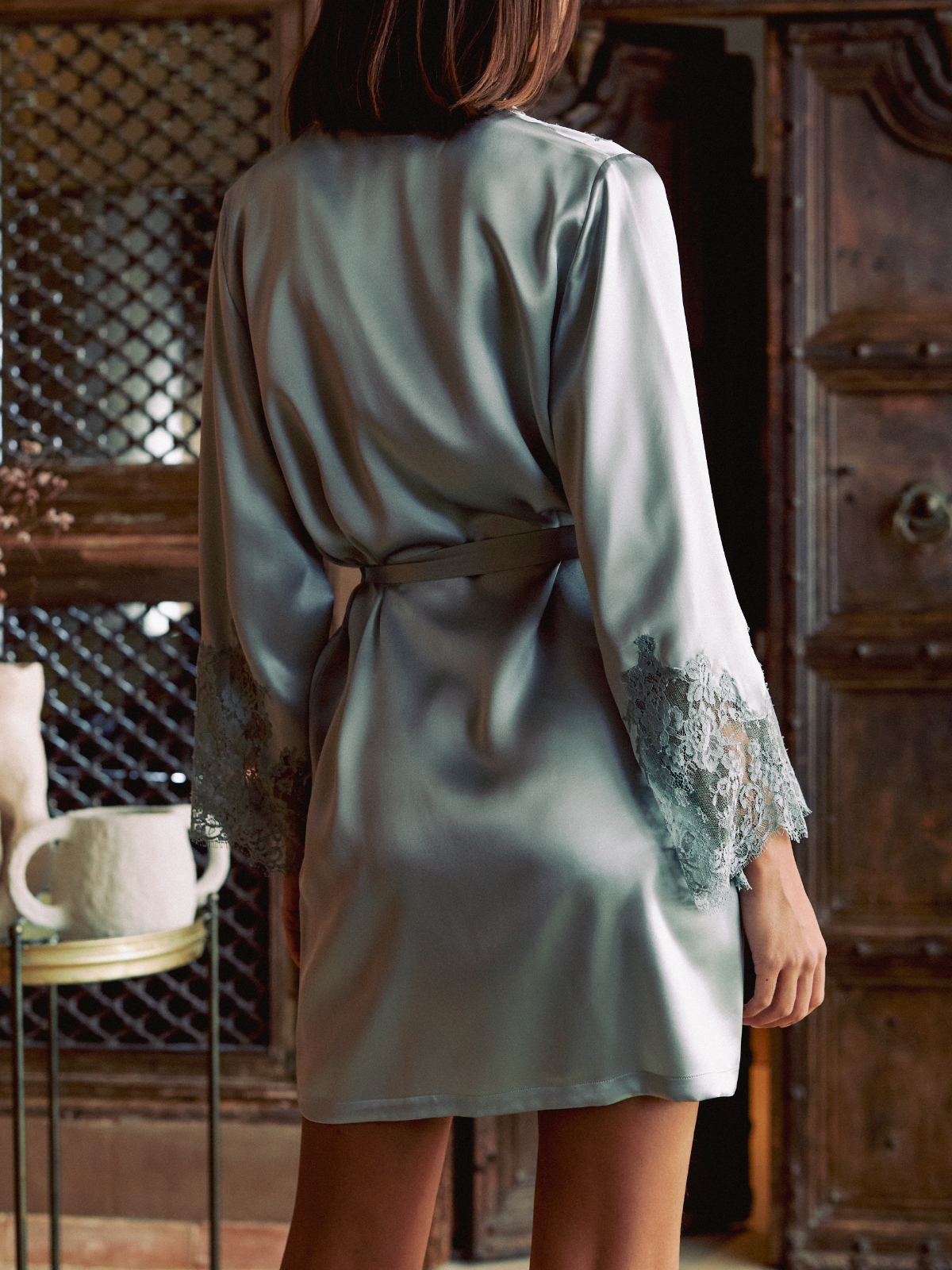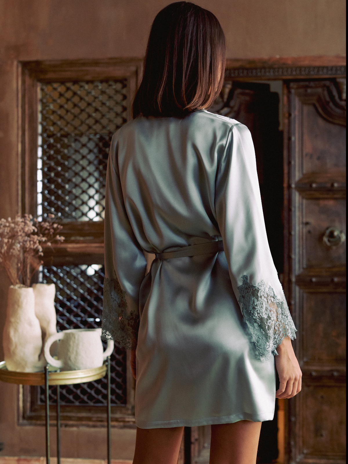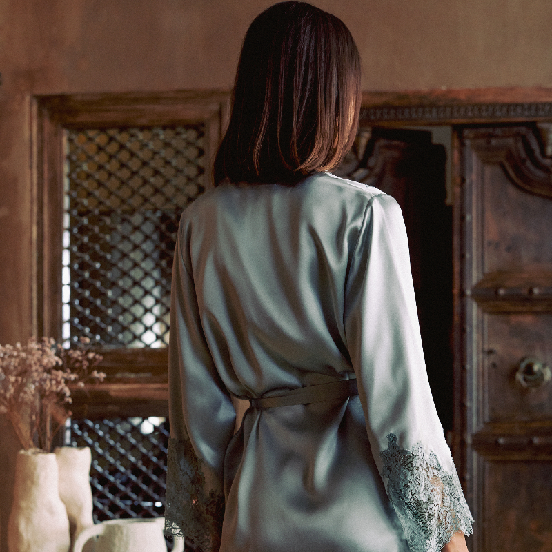 Župan Pearl je skutečnou perlou ve světe nočního prádla. Jemný hedvábný satén lehce padá přes ženské křivky a vykládaní ručně vystřihovanou francouzskou krajkou zdůrazní krásu pokožky tím nejsvůdnějším způsobem. Dopřejte si pocítit nevídaný luxus, který přináší dokonalé spojení krajky a hedvábí od Marjolaine.